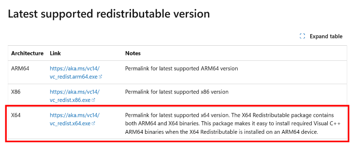 - Be sure to select the X64 version (outlined in red in the screenshot below). The others will NOT work.